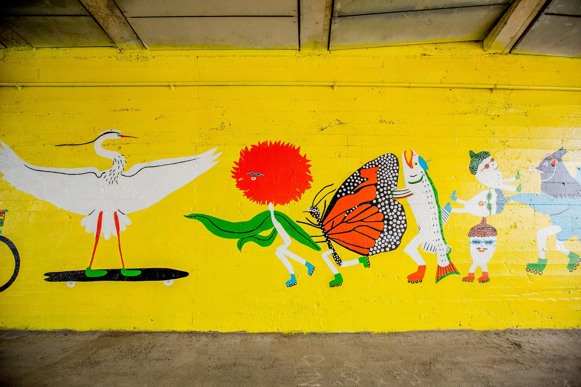 This 2,550 sq foot mural, which is located along the Guadalupe River Trail, was created to serve programs for children in underserved neighborhoods to have an opportunity to visit natural spaces and learn about local wildlife in a fun whimsical way.